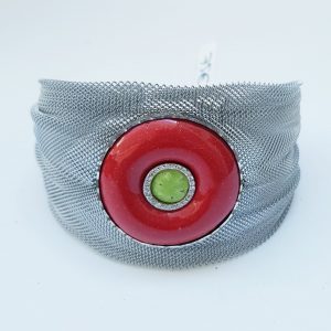 PRODUCTO: Brazalete de malla acero inoxidable montado con cerámica de 20 mm con base de plata de ley diseñado y fabricado por nuestra propia marca De Barro y Plata.